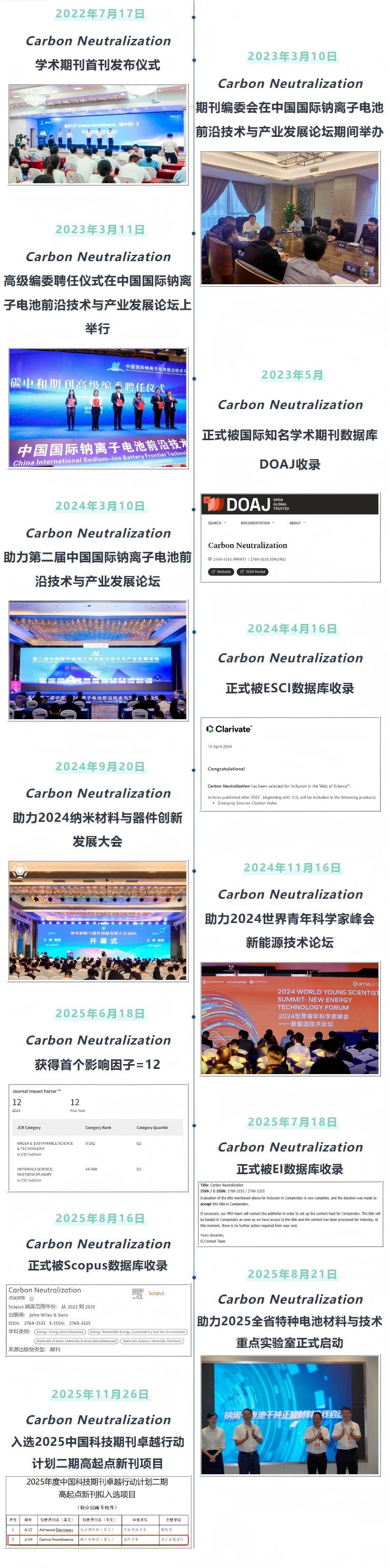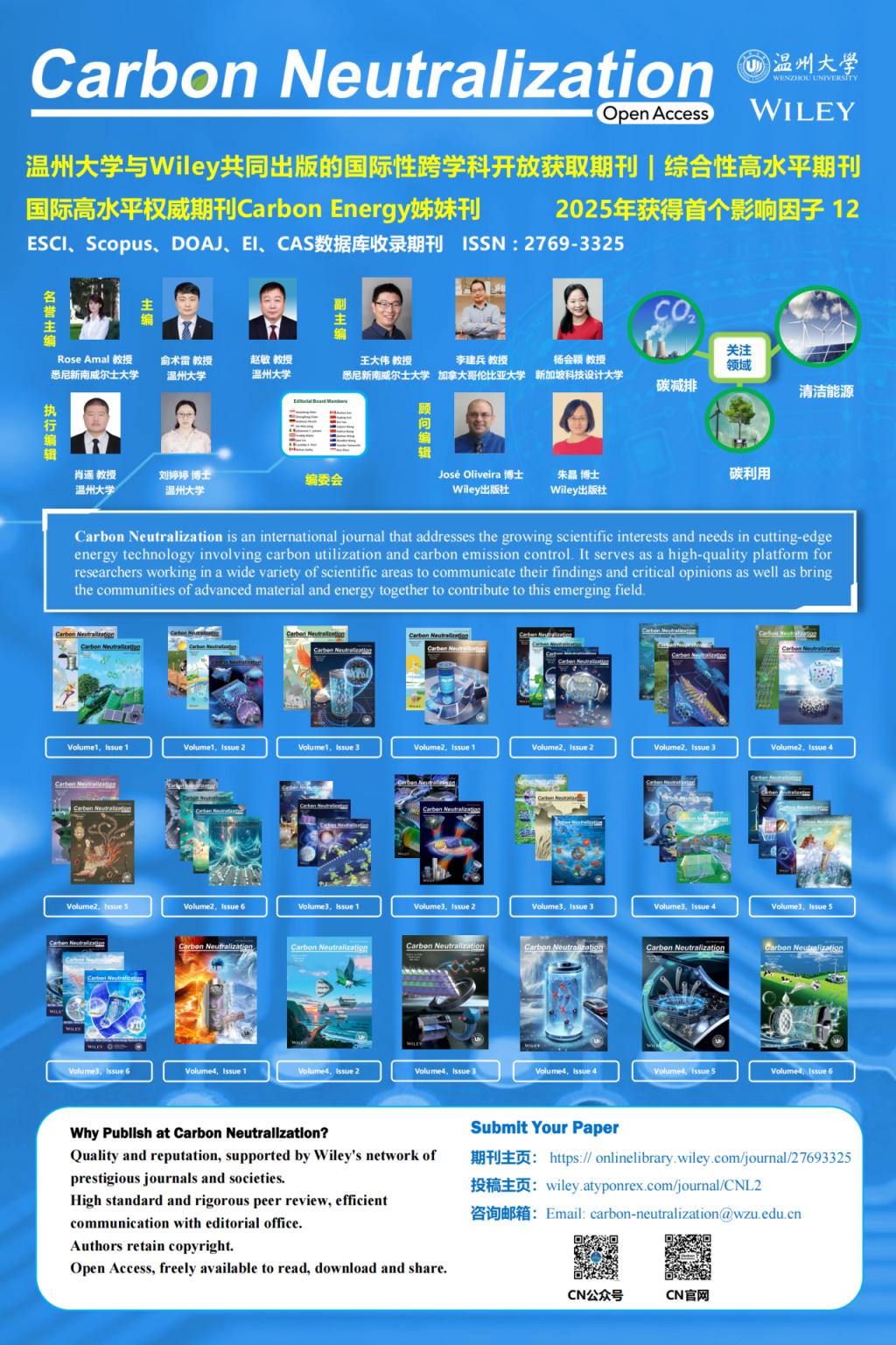 Carbon Neutralization是温州大学与Wiley共同出版的国际性跨学科开放获取期刊,立志成为综合性旗舰期刊。期刊于2022年创刊,名誉主编由澳大利亚新南威尔士大学Rose Amal院士担任,主编由温州大学校长赵敏教授和温州大学碳中和技术创新研究院院长侴术雷教授担任,编委会由来自11个国家和地区的28名国际知名专家学者组成,其中编委会19位编委入选2025年度全球“高被引科学家”。且期刊已被ESCI、Scopus、EI、CAS、DOAJ数据库收录,入选为中国科技期刊卓越行动计划二期高起点新刊,并于2025年获得首个影响因子 12 。